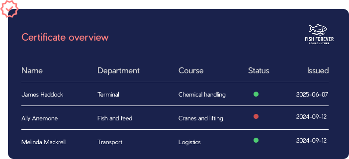 Vi samarbeider med en rekke skoler innen akvakultur. Ansetter du en lærling, er sjansen stor for at vedkommende allerede har sertifikater i vårt system. Ansetter du noen som tidligere har brukt Blue Planet Academy, følger sertifikatene deres med over til din virksomhet. Slipp unødvendig papirarbeid. Med oss har du all dokumentasjon samlet på ett sted, slik at du kan fokusere på driften, ikke administrasjonen.